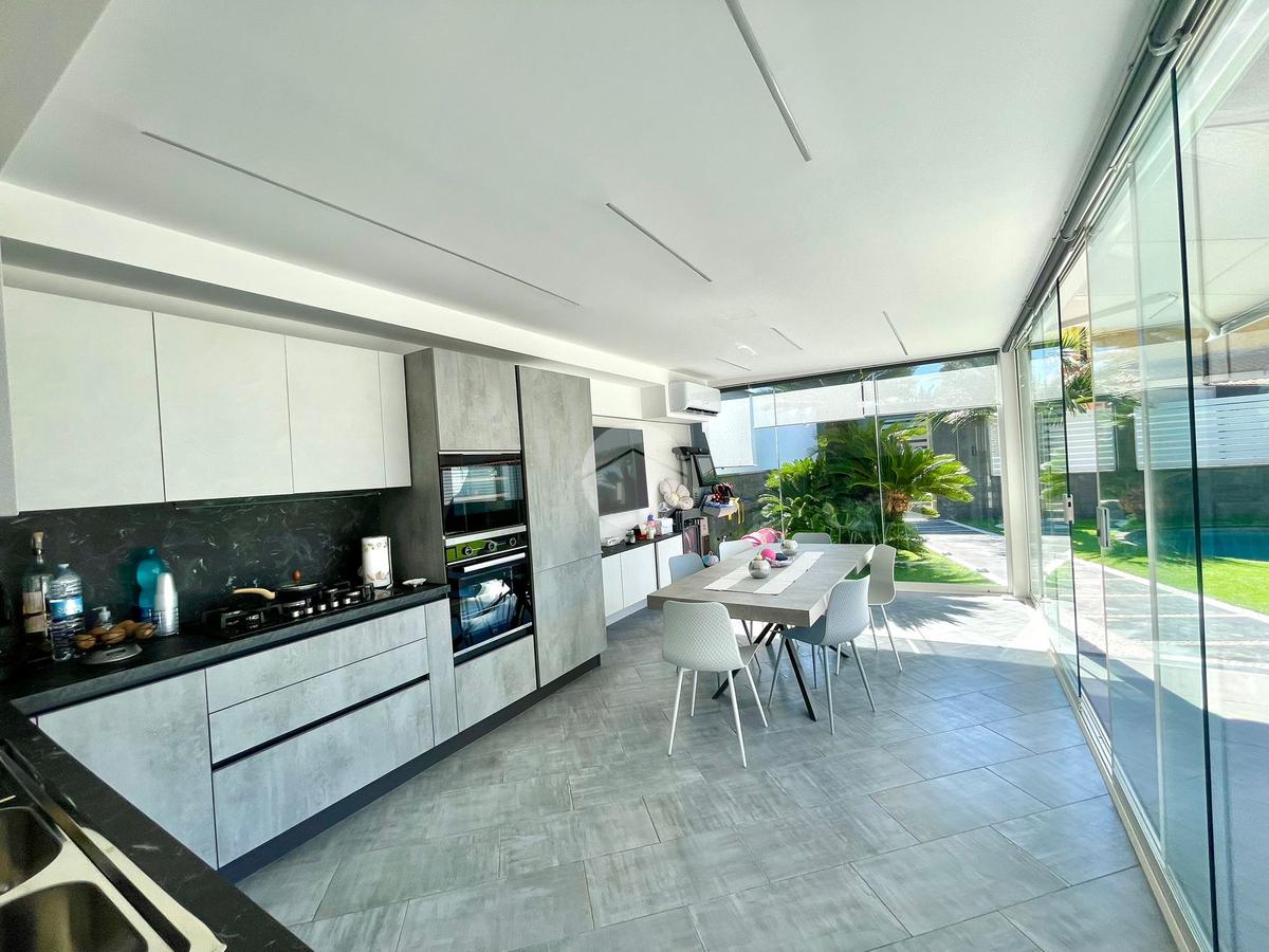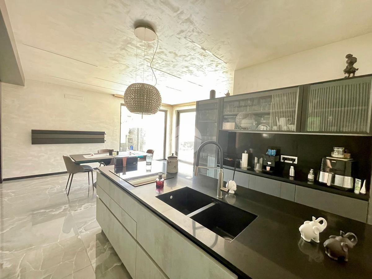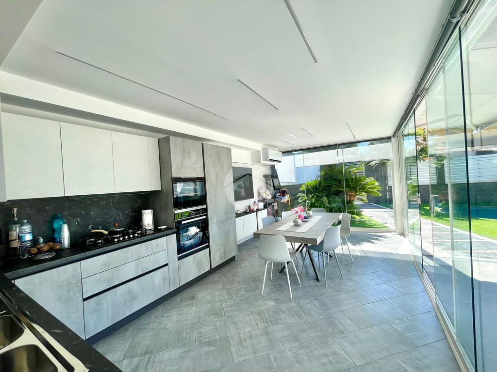 Una cucina di design, con ampie vetrate a parete che si affacciano sull'intera proprietà, offre uno spettacolo quotidiano di luce, verde e privacy, perfetto per chi ama vivere gli spazi in armonia con l'esterno.