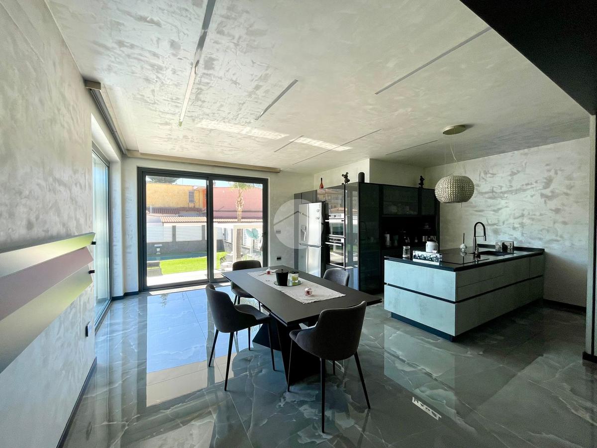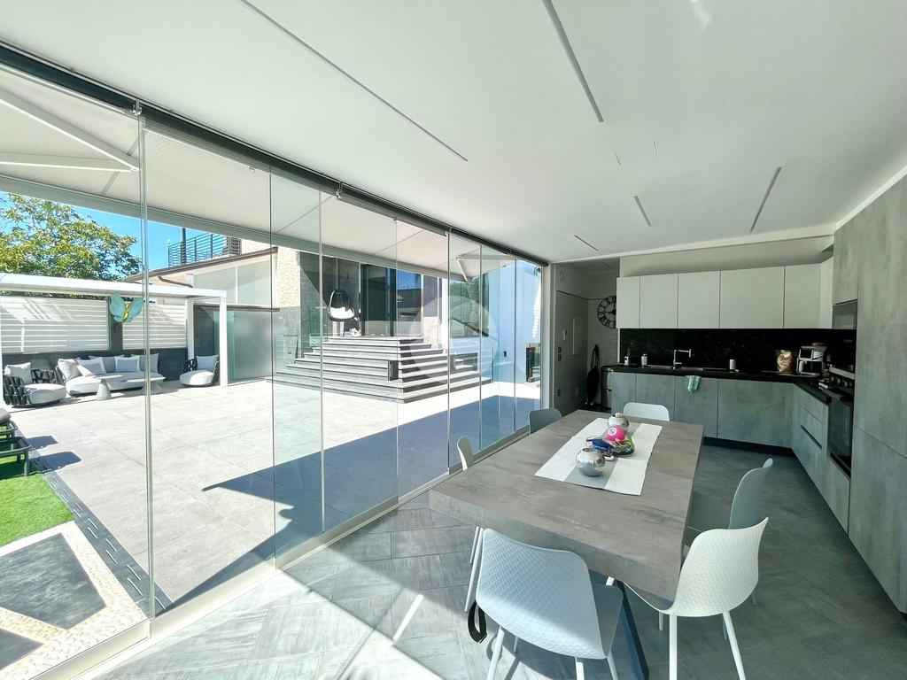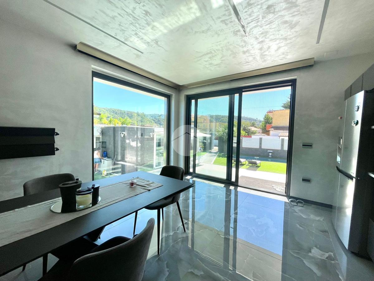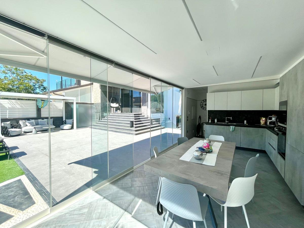 Una cucina di design, con ampie vetrate a parete che si affacciano sull'intera proprietà, offre uno spettacolo quotidiano di luce, verde e privacy, perfetto per chi ama vivere gli spazi in armonia con l'esterno.